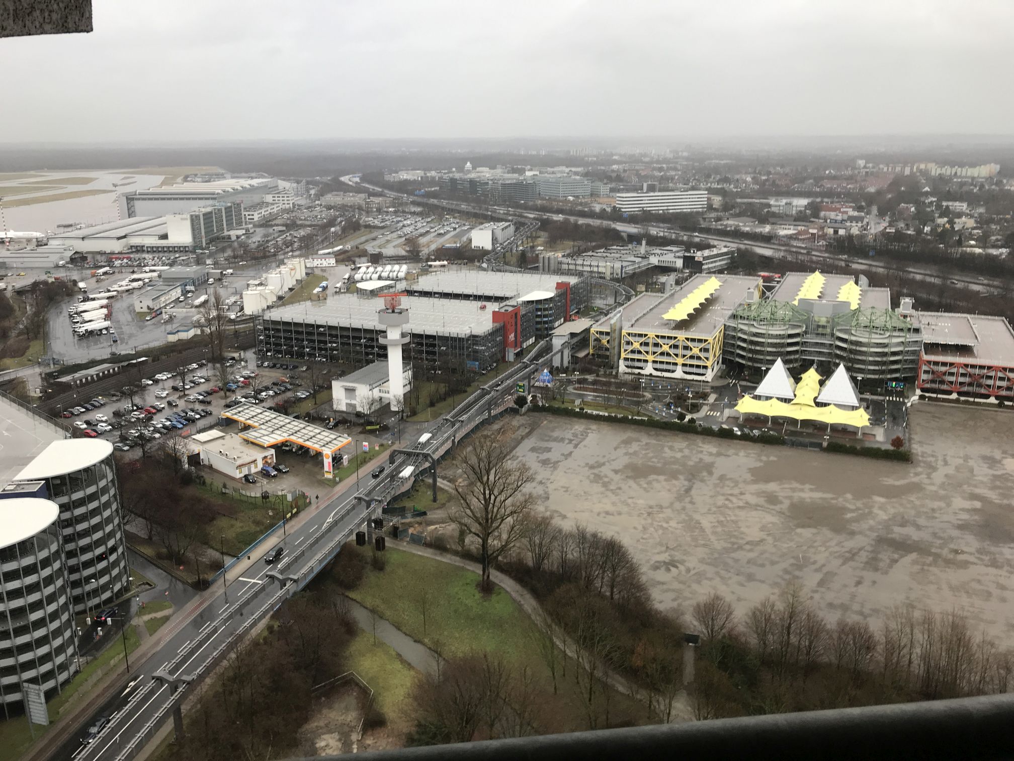 Man erkennt die gelben Hütchen auf dem zum damaligen Zeitpunkt umgebauten Parkplatz im ersten Bild und diesmal in der Rückansicht und erkennt, wie hoch dieser Tower über das Gelände des Düsseldorfer Flughafens hinausragt.